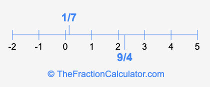 We'll start by presenting the illustration below that shows you where 1/7 and 9/4 are positioned on a number line. This will help you fully understand and visualize our calculations.