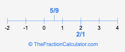 We'll start by presenting the illustration below that shows you where 2/1 and 5/9 are positioned on a number line. This will help you fully understand and visualize our calculations.