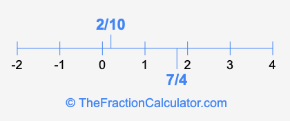 We'll start by presenting the illustration below that shows you where 2/10 and 7/4 are positioned on a number line. This will help you fully understand and visualize our calculations.