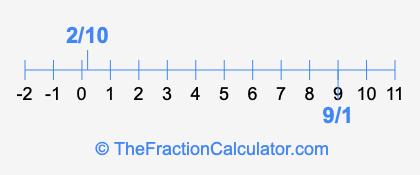 We'll start by presenting the illustration below that shows you where 2/10 and 9/1 are positioned on a number line. This will help you fully understand and visualize our calculations.