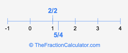 We'll start by presenting the illustration below that shows you where 2/2 and 5/4 are positioned on a number line. This will help you fully understand and visualize our calculations.