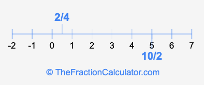 We'll start by presenting the illustration below that shows you where 2/4 and 10/2 are positioned on a number line. This will help you fully understand and visualize our calculations.
