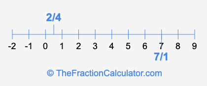 We'll start by presenting the illustration below that shows you where 2/4 and 7/1 are positioned on a number line. This will help you fully understand and visualize our calculations.