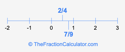 We'll start by presenting the illustration below that shows you where 2/4 and 7/9 are positioned on a number line. This will help you fully understand and visualize our calculations.