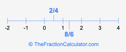 We'll start by presenting the illustration below that shows you where 2/4 and 8/6 are positioned on a number line. This will help you fully understand and visualize our calculations.