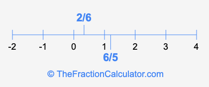 We'll start by presenting the illustration below that shows you where 2/6 and 6/5 are positioned on a number line. This will help you fully understand and visualize our calculations.