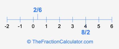 We'll start by presenting the illustration below that shows you where 2/6 and 8/2 are positioned on a number line. This will help you fully understand and visualize our calculations.