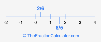 We'll start by presenting the illustration below that shows you where 2/6 and 8/5 are positioned on a number line. This will help you fully understand and visualize our calculations.