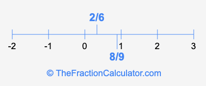 We'll start by presenting the illustration below that shows you where 2/6 and 8/9 are positioned on a number line. This will help you fully understand and visualize our calculations.
