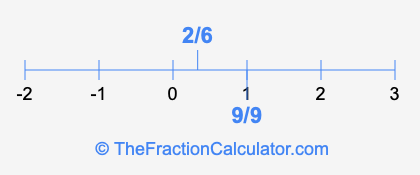 We'll start by presenting the illustration below that shows you where 2/6 and 9/9 are positioned on a number line. This will help you fully understand and visualize our calculations.