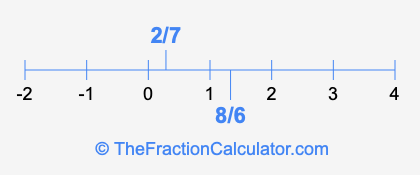 We'll start by presenting the illustration below that shows you where 2/7 and 8/6 are positioned on a number line. This will help you fully understand and visualize our calculations.