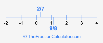We'll start by presenting the illustration below that shows you where 2/7 and 9/8 are positioned on a number line. This will help you fully understand and visualize our calculations.