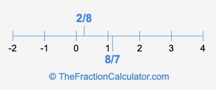 We'll start by presenting the illustration below that shows you where 2/8 and 8/7 are positioned on a number line. This will help you fully understand and visualize our calculations.