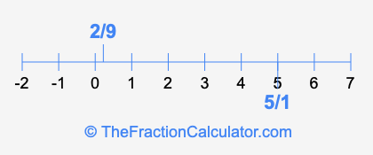 We'll start by presenting the illustration below that shows you where 2/9 and 5/1 are positioned on a number line. This will help you fully understand and visualize our calculations.