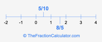 We'll start by presenting the illustration below that shows you where 5/10 and 8/5 are positioned on a number line. This will help you fully understand and visualize our calculations.