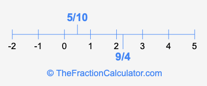 We'll start by presenting the illustration below that shows you where 5/10 and 9/4 are positioned on a number line. This will help you fully understand and visualize our calculations.