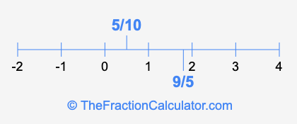 We'll start by presenting the illustration below that shows you where 5/10 and 9/5 are positioned on a number line. This will help you fully understand and visualize our calculations.