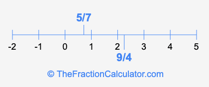 We'll start by presenting the illustration below that shows you where 5/7 and 9/4 are positioned on a number line. This will help you fully understand and visualize our calculations.