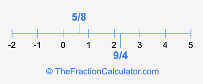 We'll start by presenting the illustration below that shows you where 5/8 and 9/4 are positioned on a number line. This will help you fully understand and visualize our calculations.