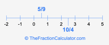 We'll start by presenting the illustration below that shows you where 5/9 and 10/4 are positioned on a number line. This will help you fully understand and visualize our calculations.