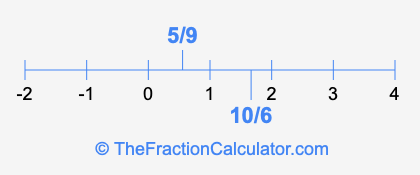 We'll start by presenting the illustration below that shows you where 5/9 and 10/6 are positioned on a number line. This will help you fully understand and visualize our calculations.