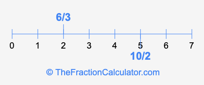 We'll start by presenting the illustration below that shows you where 6/3 and 10/2 are positioned on a number line. This will help you fully understand and visualize our calculations.