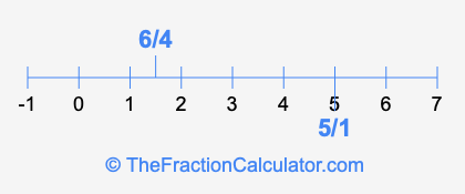 We'll start by presenting the illustration below that shows you where 6/4 and 5/1 are positioned on a number line. This will help you fully understand and visualize our calculations.