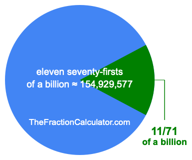 Therefore, 11/71 of a billion is the quotient of one billion divided by 71, multiplied by 11. Here is the math and the answer: