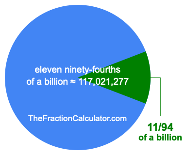 Therefore, 11/94 of a billion is the quotient of one billion divided by 94, multiplied by 11. Here is the math and the answer:
