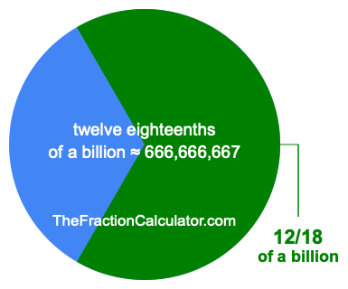 Therefore, 12/18 of a billion is the quotient of one billion divided by 18, multiplied by 12. Here is the math and the answer: