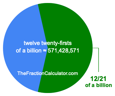 Therefore, 12/21 of a billion is the quotient of one billion divided by 21, multiplied by 12. Here is the math and the answer: