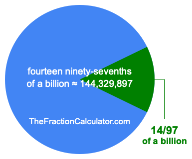 Therefore, 14/97 of a billion is the quotient of one billion divided by 97, multiplied by 14. Here is the math and the answer: