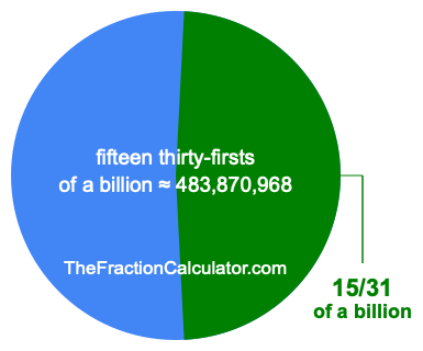 Therefore, 15/31 of a billion is the quotient of one billion divided by 31, multiplied by 15. Here is the math and the answer:
