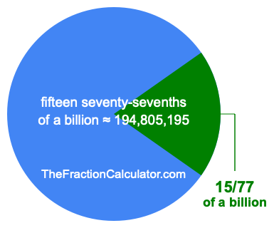 Therefore, 15/77 of a billion is the quotient of one billion divided by 77, multiplied by 15. Here is the math and the answer: