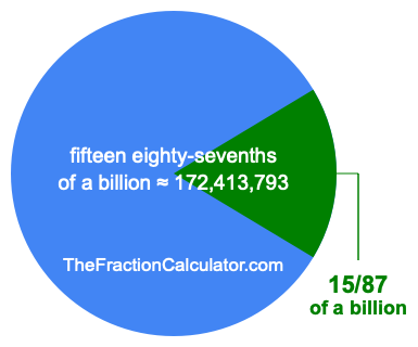 Therefore, 15/87 of a billion is the quotient of one billion divided by 87, multiplied by 15. Here is the math and the answer: