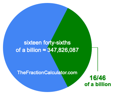 Therefore, 16/46 of a billion is the quotient of one billion divided by 46, multiplied by 16. Here is the math and the answer: