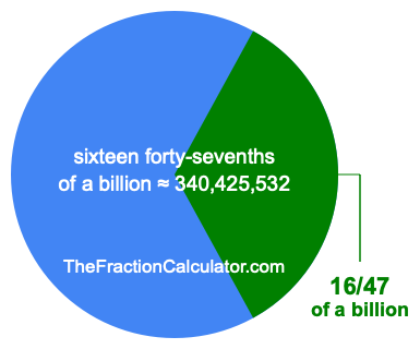 Therefore, 16/47 of a billion is the quotient of one billion divided by 47, multiplied by 16. Here is the math and the answer: