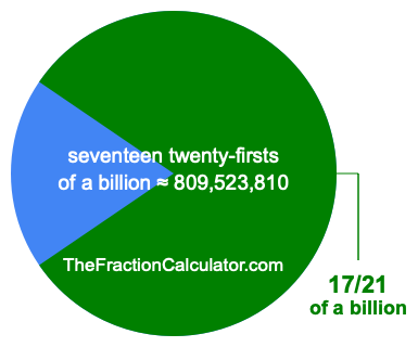 Therefore, 17/21 of a billion is the quotient of one billion divided by 21, multiplied by 17. Here is the math and the answer: