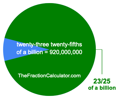 Therefore, 23/25 of a billion is the quotient of one billion divided by 25, multiplied by 23. Here is the math and the answer: