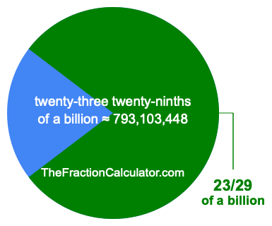 Therefore, 23/29 of a billion is the quotient of one billion divided by 29, multiplied by 23. Here is the math and the answer: