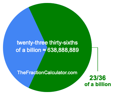 Therefore, 23/36 of a billion is the quotient of one billion divided by 36, multiplied by 23. Here is the math and the answer: