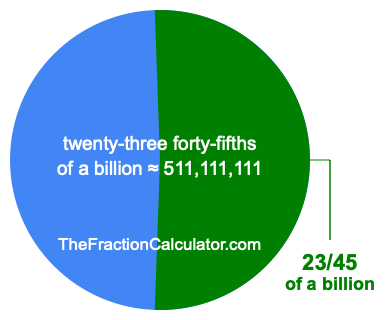 Therefore, 23/45 of a billion is the quotient of one billion divided by 45, multiplied by 23. Here is the math and the answer: