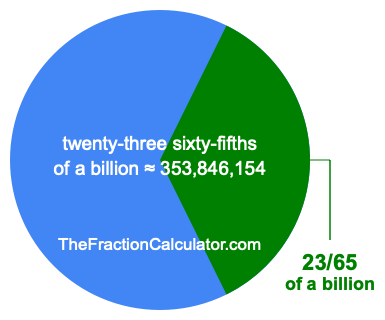 Therefore, 23/65 of a billion is the quotient of one billion divided by 65, multiplied by 23. Here is the math and the answer:
