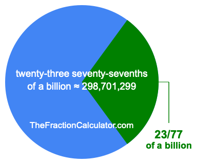 Therefore, 23/77 of a billion is the quotient of one billion divided by 77, multiplied by 23. Here is the math and the answer: