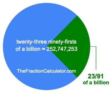 Therefore, 23/91 of a billion is the quotient of one billion divided by 91, multiplied by 23. Here is the math and the answer: