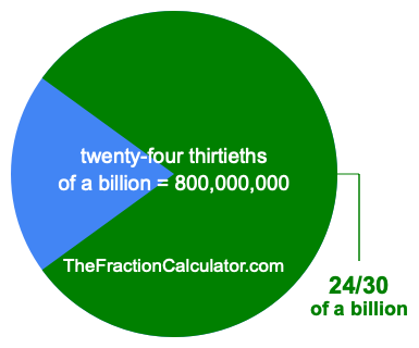Therefore, 24/30 of a billion is the quotient of one billion divided by 30, multiplied by 24. Here is the math and the answer: