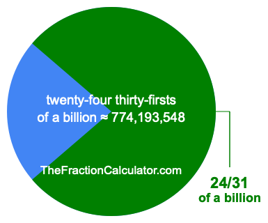 Therefore, 24/31 of a billion is the quotient of one billion divided by 31, multiplied by 24. Here is the math and the answer: