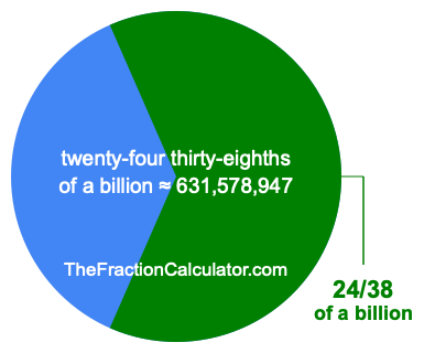 Therefore, 24/38 of a billion is the quotient of one billion divided by 38, multiplied by 24. Here is the math and the answer: