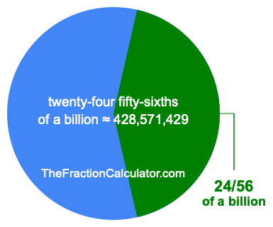 Therefore, 24/56 of a billion is the quotient of one billion divided by 56, multiplied by 24. Here is the math and the answer:
