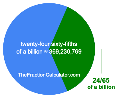 Therefore, 24/65 of a billion is the quotient of one billion divided by 65, multiplied by 24. Here is the math and the answer:
